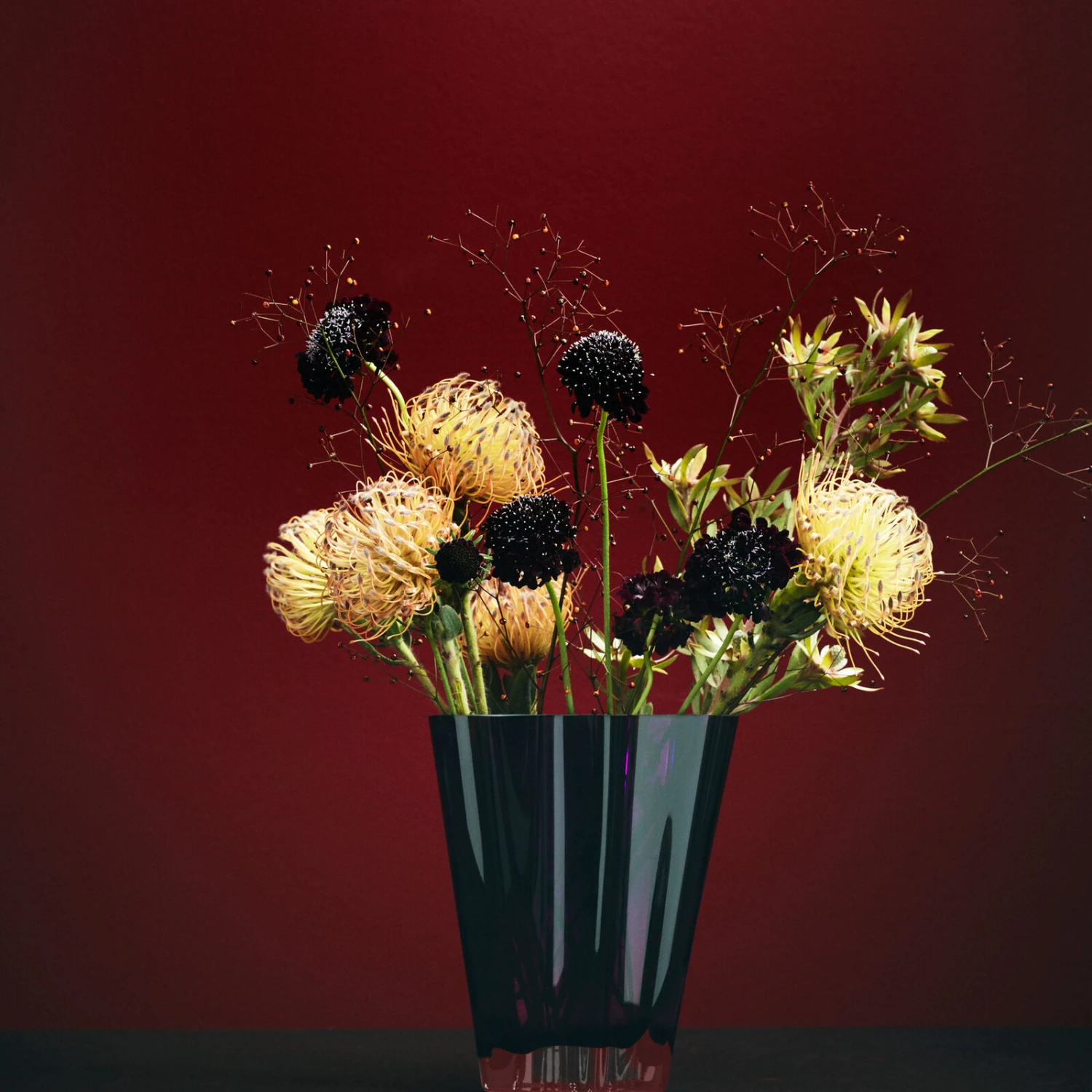 Opposites attract. Concretely at the bottom,abstractly at the top, “Flux” brings polarity to unity. The design darling made of fine porcelain is now also available as a beautifully shaped glass vase: very classic in clear, puristic in grey and in modern berry. The transparent material underlines the lightness and emphasises the flowing form of the vase, in which flower arrangements of all kinds find their stylish place.